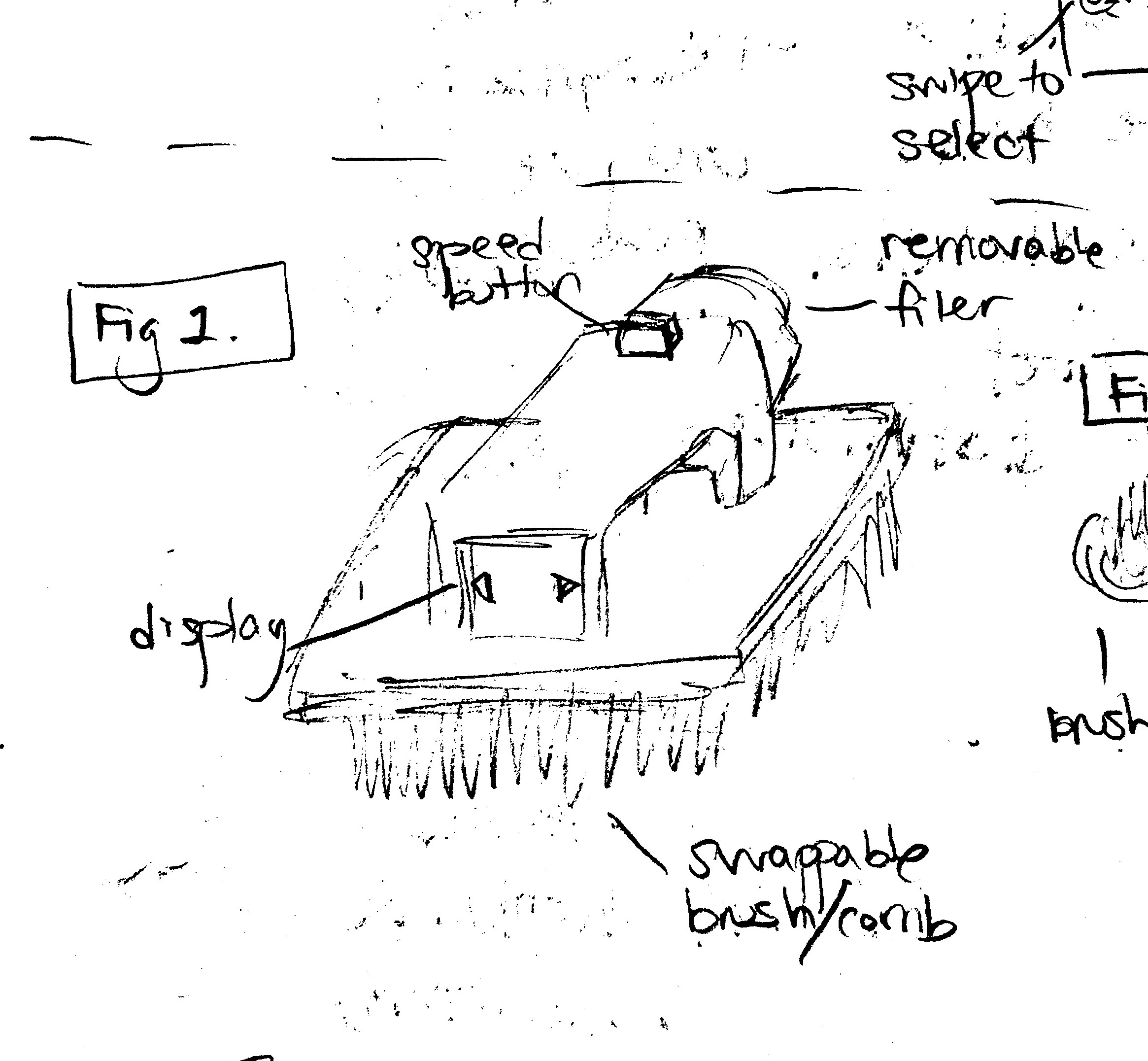 Flat and low-profile, with thin metal bristles for combing. Explored placing the digital display behind and a speed button on the spine.