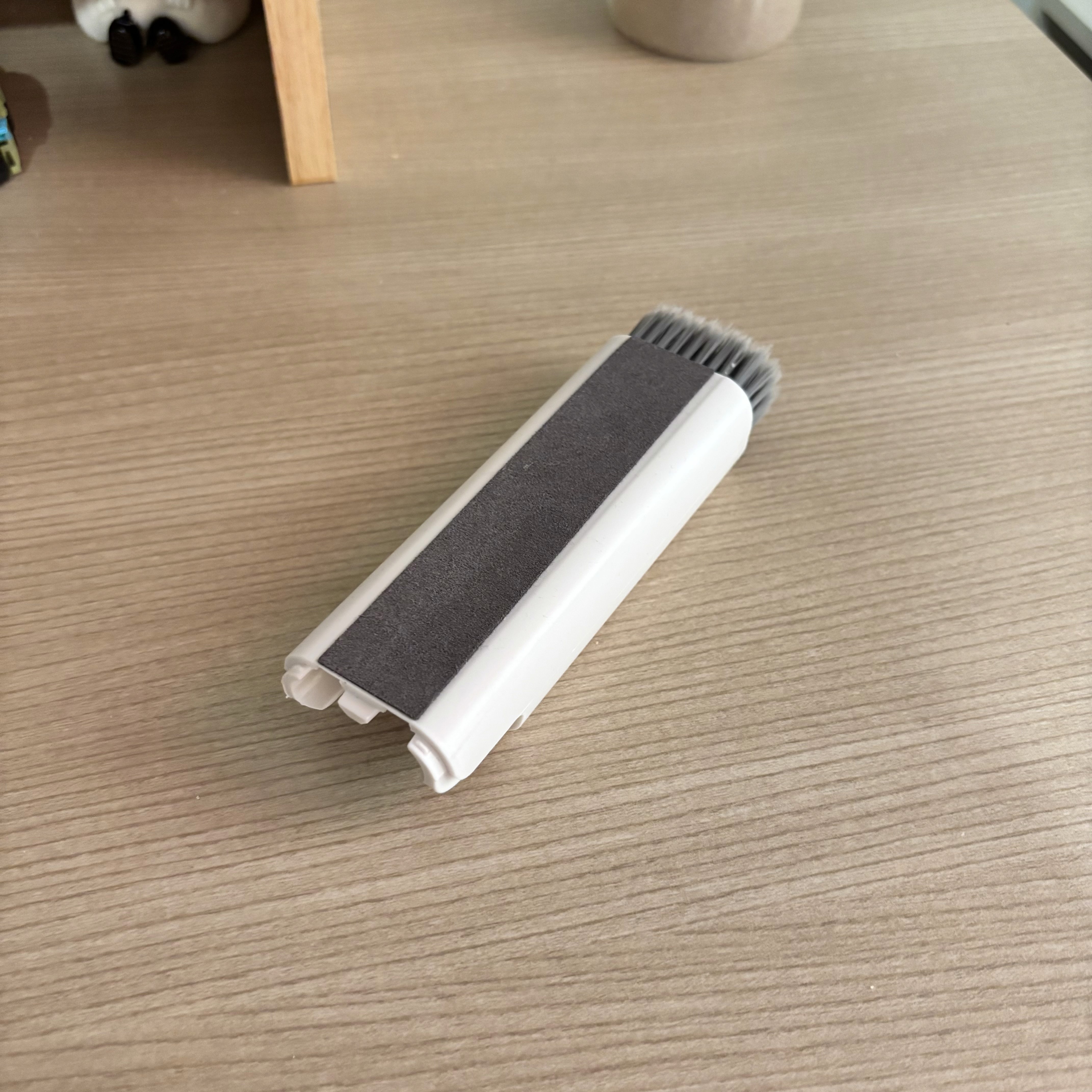 Each attachment head was distinct enough to identify by feel. The brush and comb sat at the front, the rotary filer had a circular form, and the massager attachment had a recognizable shape (which would be a lint roller). The swap mechanism used a push-and-pull click (indicated by the brown strip) to operate one-handed without looking down.