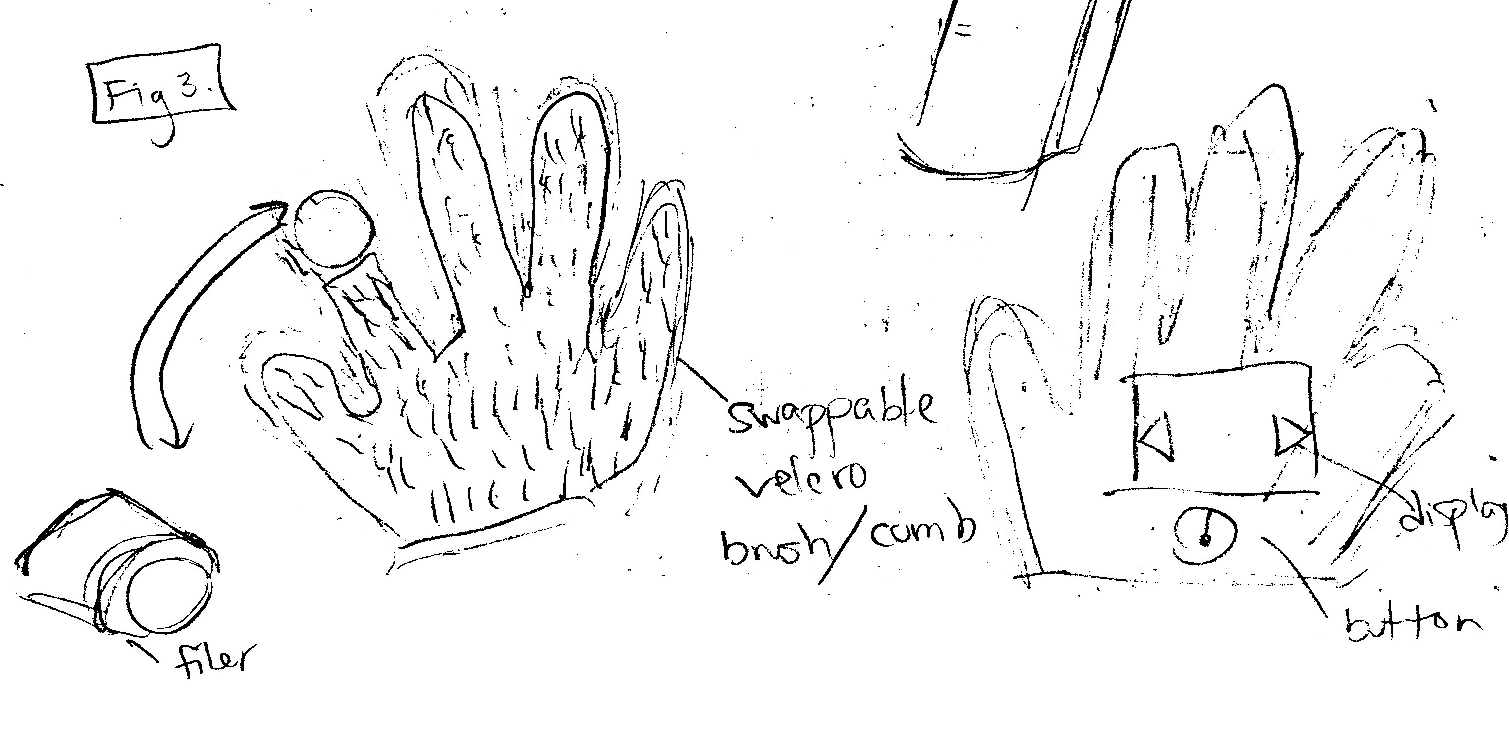 A wearable glove concept with palm brushes and a rotary filer on the pointer finger. Interesting ergonomically, but modular attachments would be difficult in a wearable form.